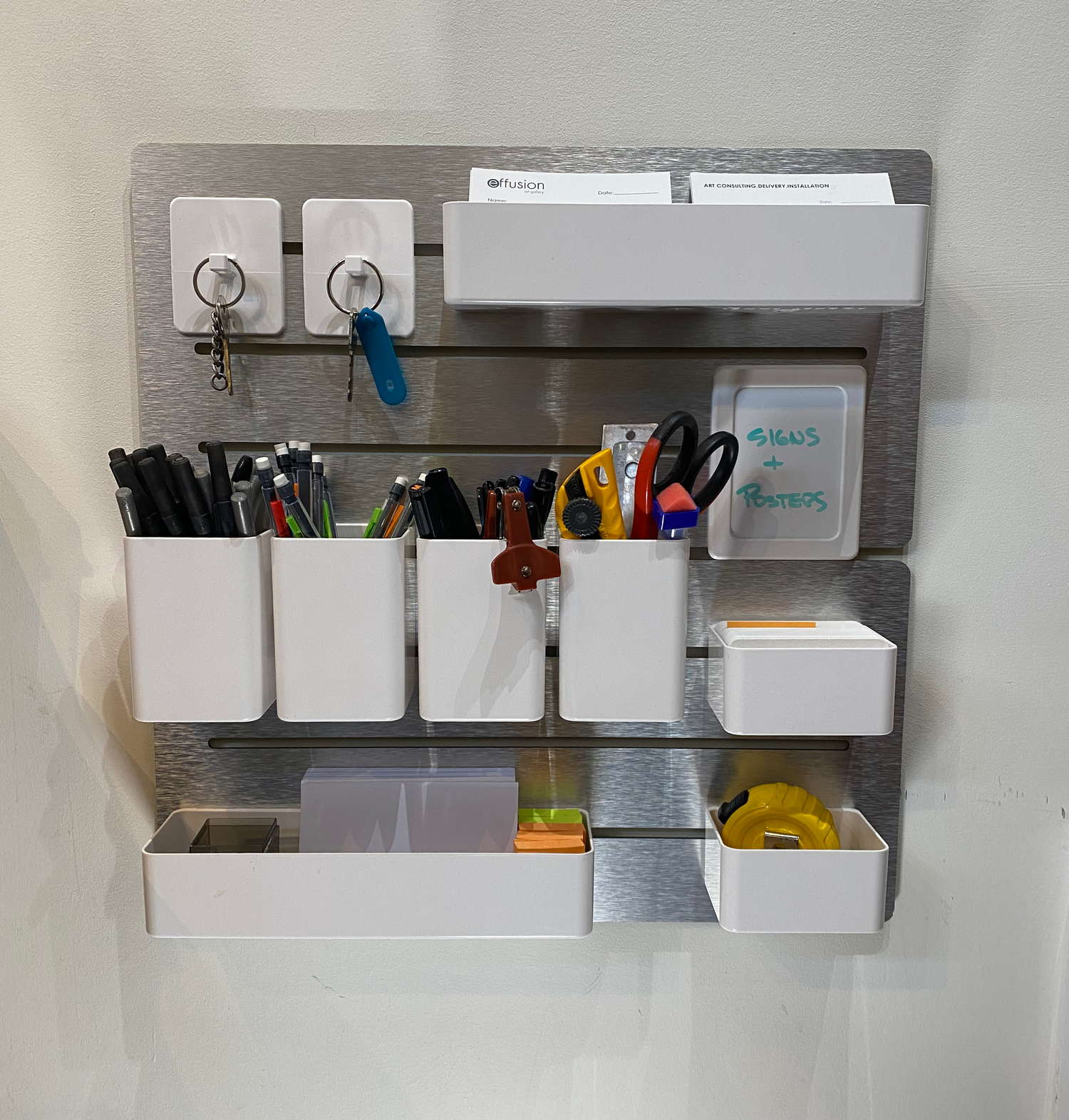 Quality innovated product arrived promptly in well packaged box. Versatile and easy to install with clear instructions . Our bench top is now uncluttered thanks to this perfect pocket product which holds all my bits and pieces . So easy to grab all in one spot as I head out the door .